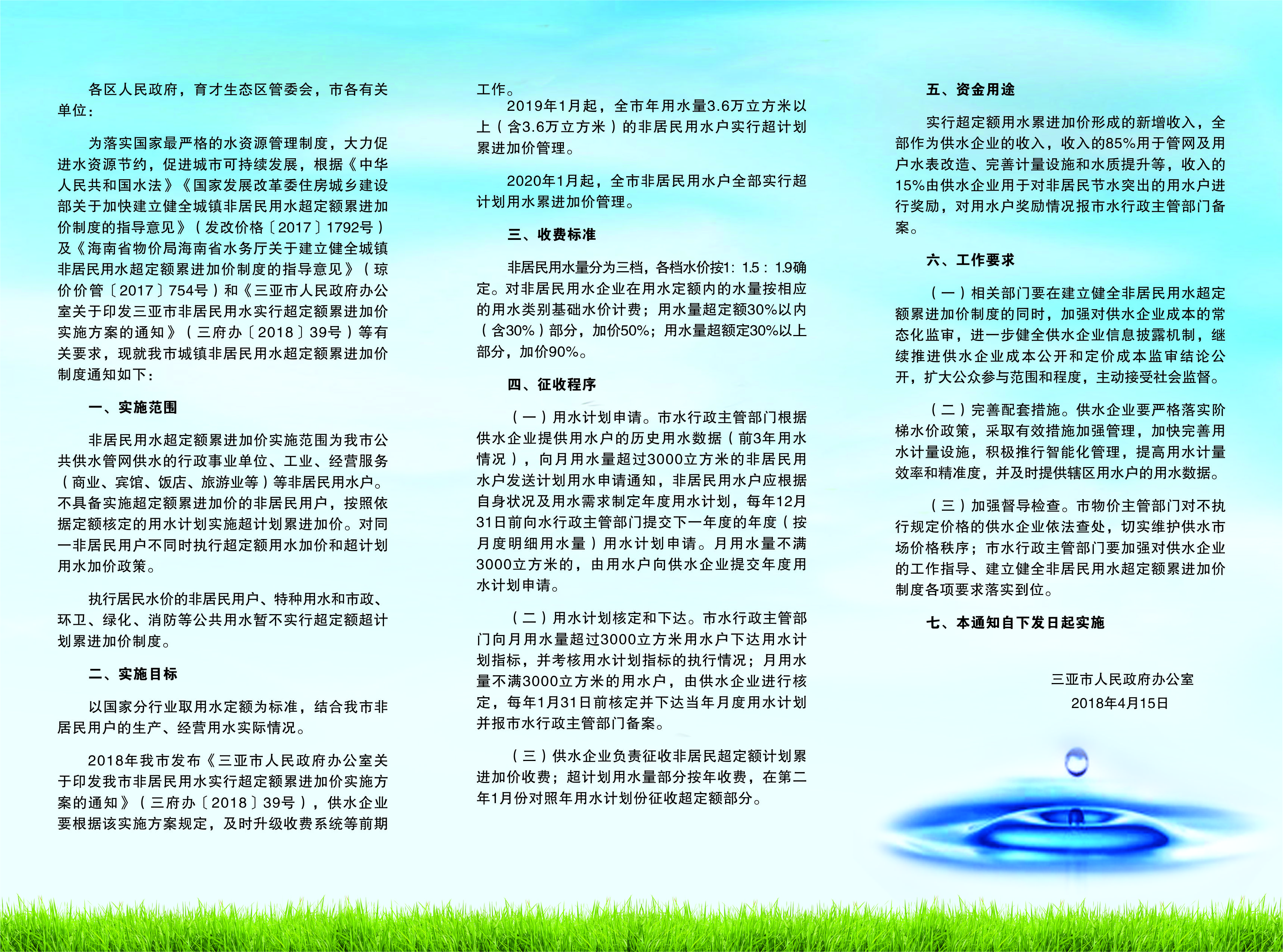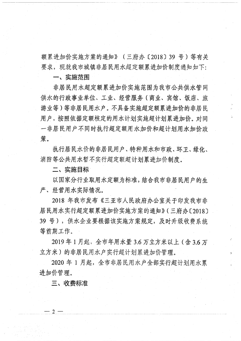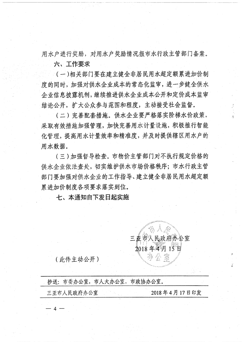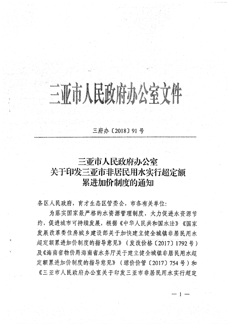 三府辦〔2018〕91號 關(guān)于印發(fā)三亞市非居民用水實(shí)行超定額累進(jìn)加價制度到通知