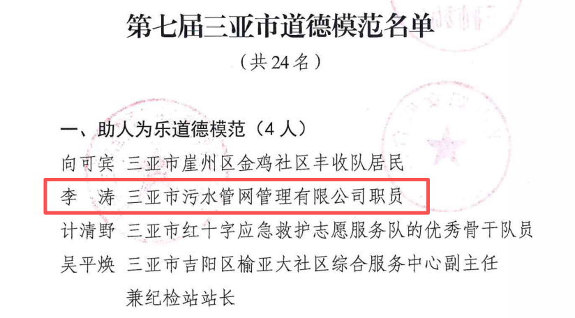 近日,中共三亞市委精神文明建設(shè)和愛國衛(wèi)生運(yùn)動委員會辦公室發(fā)布《關(guān)于對第七屆三亞市道德模范予以表揚(yáng)的通報》,三亞環(huán)農(nóng)集團(tuán)旗下三亞市污水管網(wǎng)管理有限公司職員李濤榮獲第七屆“三亞市道德模范”稱號。